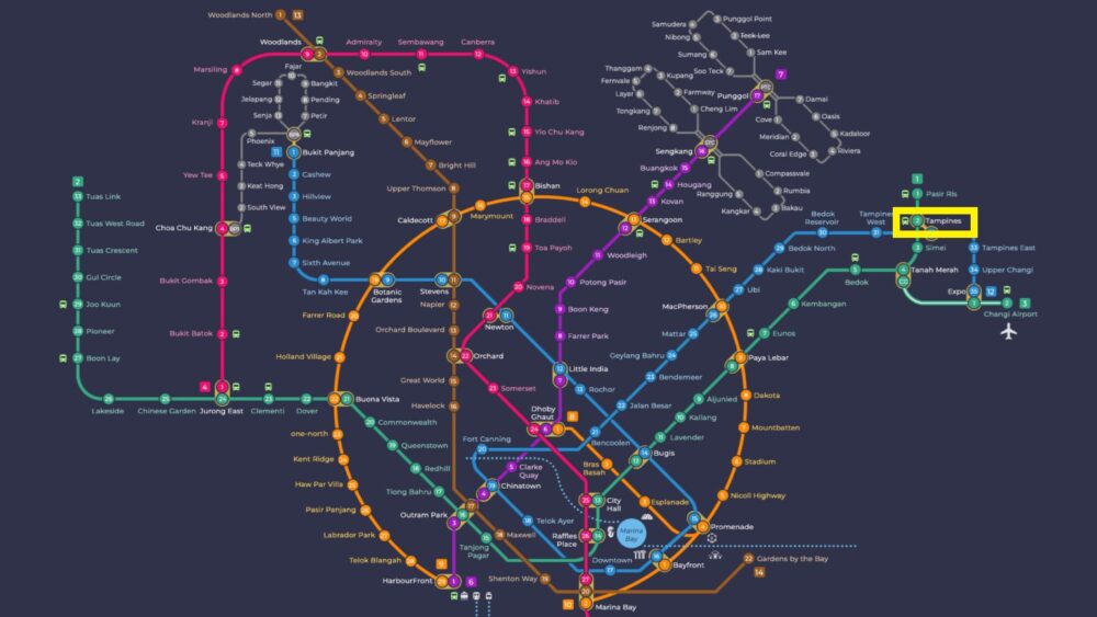 シンガポールの地下鉄MRT East-West Line(緑色の路線図)とDowntown Line(青色の路線図)のジャンクション駅となっており中心部から離れてはいますが交通の不便を感じる事はあまりないでしょう。