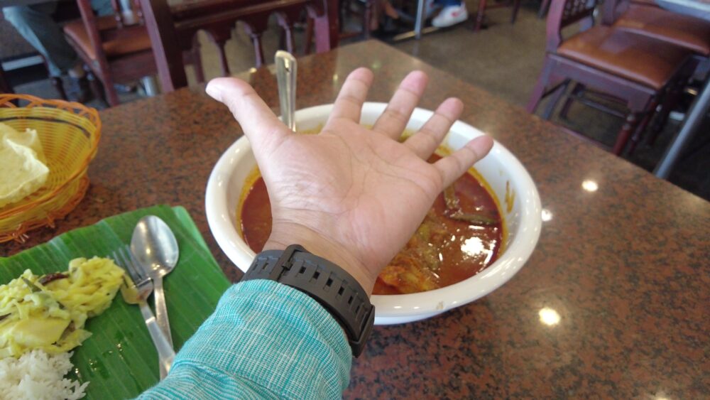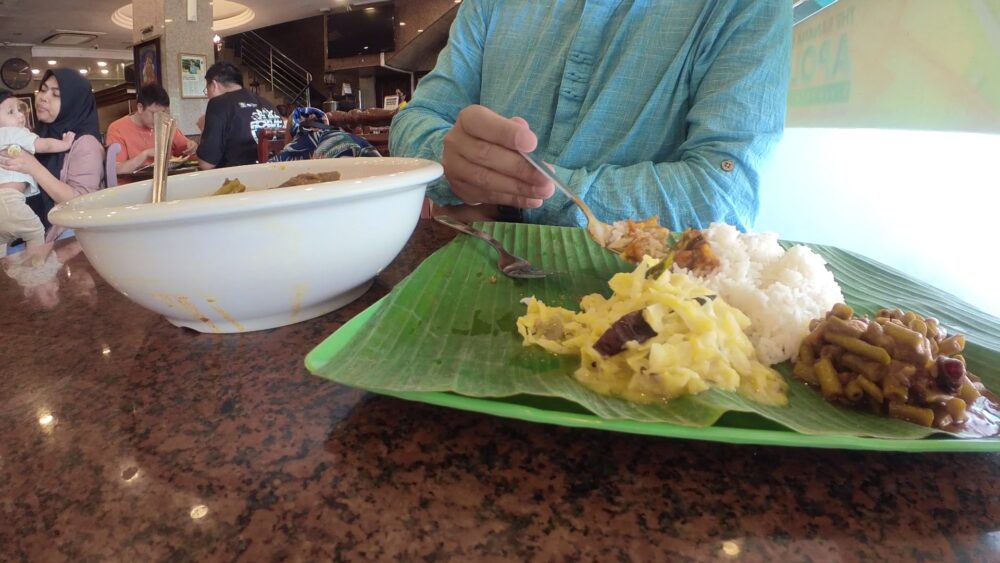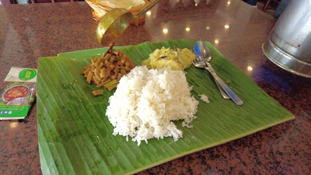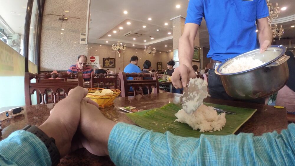 座って待っていると店員さんがお釜を抱えてやってきてバナナの葉のお皿にご飯を盛ってくれます。ちなみにご飯がなくなるとおかわりをいるかと聞いてきます。いつもお腹いっぱいでおかわりを頼んだことはないのですがおそらくおかわりは無料な感じです(ご自身でご確認くださいませ)。